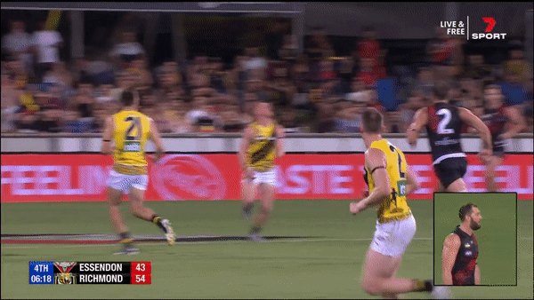 So in the Dogs-Dees game, Laitham Vandermeer shanks his kick forward to Michael Hibberd.