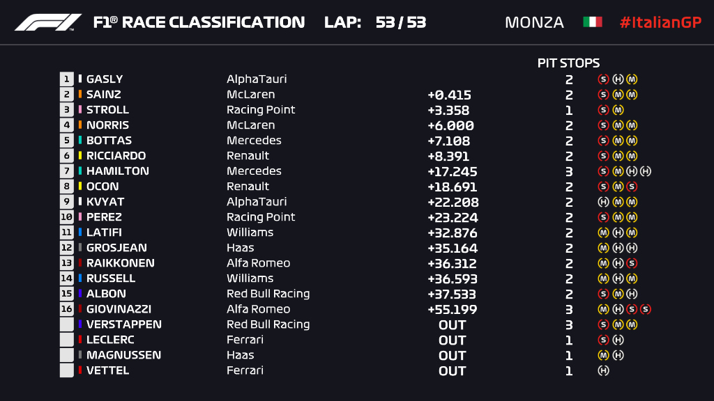 Finally getting the benefit of the open rear wing, the McLaren-Renault charged at the Alpha Tauri, but Sainz was never truly close enough to make a lunge, as the ice cold Frenchman never even flinched, and capping off one of the most memorable races of the Turbo-Hybrid era of F1, Pierre Gasly became the 109th Grand Prix winner!