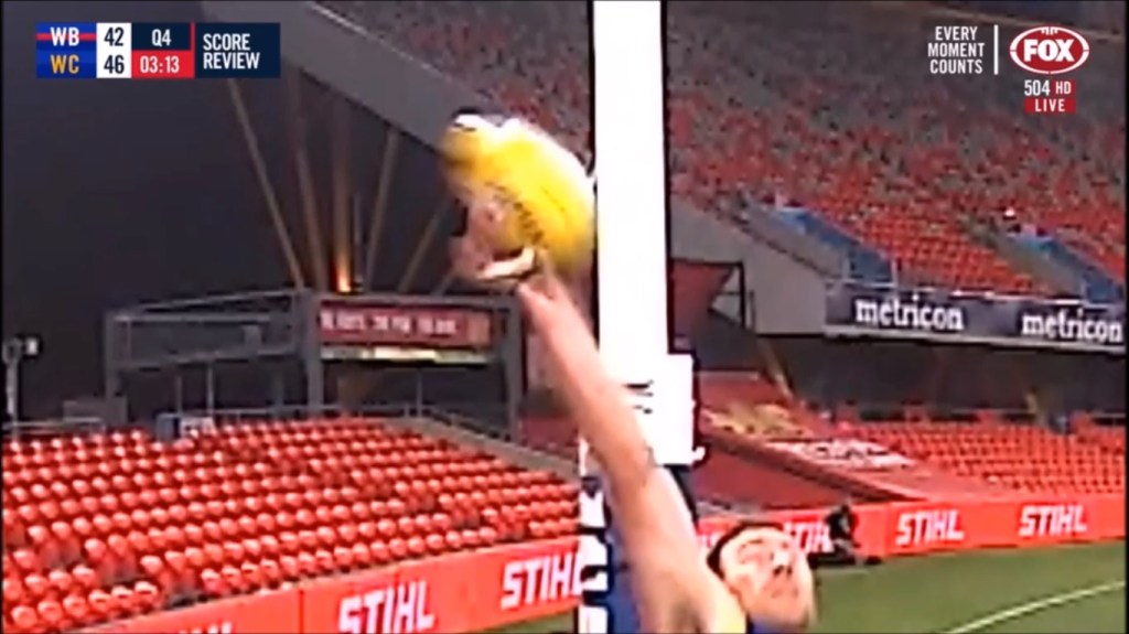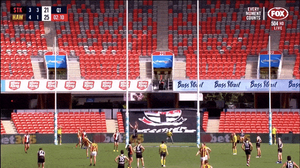 St Kilda vs Hawthorn – The cameraperson behind the goals gets a beauty from Tim O’Brien after Timmy kicks a goal.