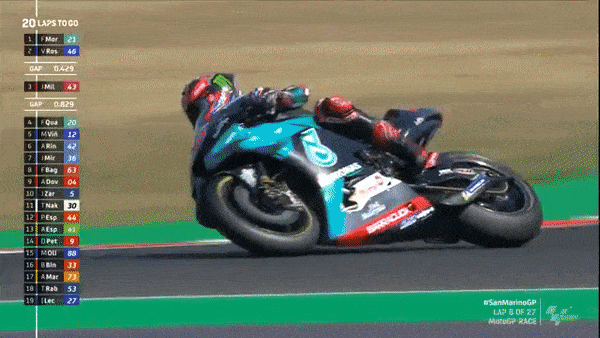 At the start, Quartararo and Vinales got swallowed thanks to poor launches, Morbidelli pinged the lids and led from Rossi, and Miller used the launch control to eventually make his way up to 3rd place with a fine move on Vinales at Turn 10, and that poor start from Quartararo seemed to really screw his rhythm, because he wasn’t able to control the race…. Same story for Maverick.