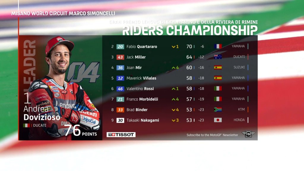Dovi took the championship lead with 7th, while Miller finished 9th on the road, but was sent back up to 8th after Nakagami was demoted a place for exceeding track limits on the last lap, leaving Jack 6 points off Quartararo, as the Top 9 riders are now all within a race win of each other – 23 points!