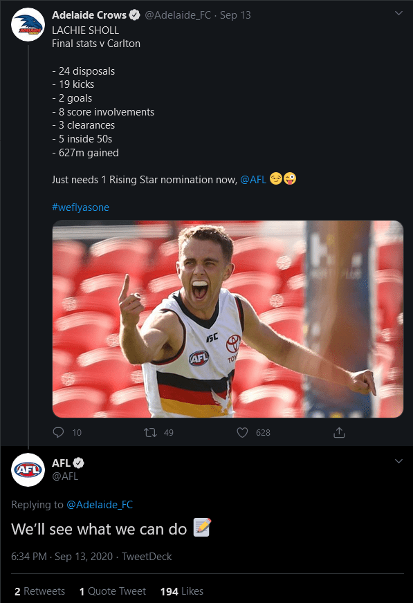 Let’s once again remember that Lachie Sholl couldn’t earn a Rising Star nomination for his massive performance against Carlton, despite the AFL’s Twitter account giving the Crows hope, before doing stuff all to stop Isaac Quaynor getting the gong for a mild game off half-back.
