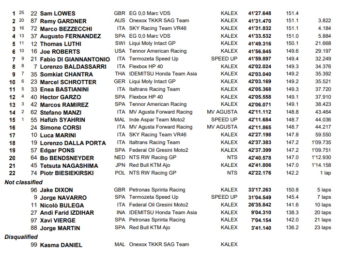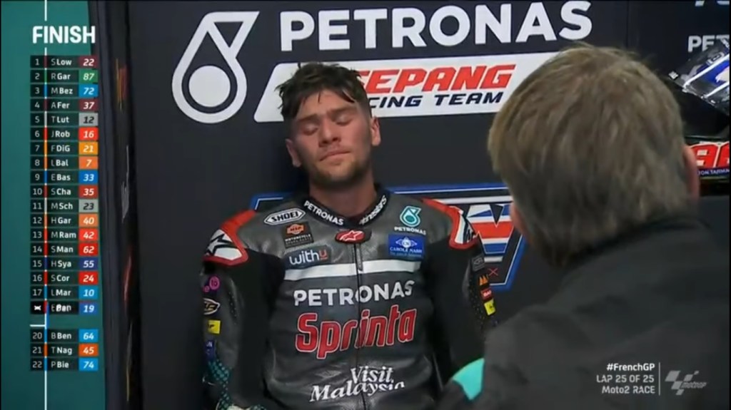 So as those two battled on, Xavi Vierge high-sided out of the race right in front of Gardner on Lap 5, Luca Marini wasn’t even in the Top 15, but wasn’t losing many points to Enea Bastianini, who would be penalised later in the race, while Roberts was into the Top 10 by Lap 15, and there was the case of Gardner’s teammate Kasma Daniel, who: