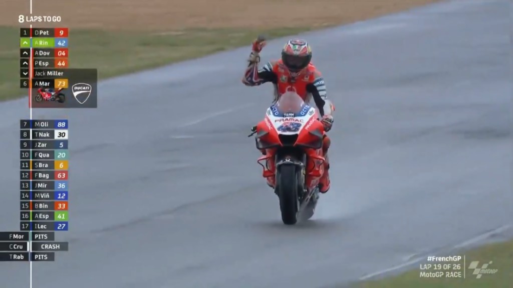 Dovi would hold on for 4th, while Flying Frenchman Zarco also passed Oliveira for 5th at the penultimate corner, capping off a super day for the Ducatis, and the V4 bikes (Ducati, KTM and Honda) in general, who utterly crushed the Inline-fours in the wet, mostly because they couldn’t utilise their cornering advantage in the stop and go slower conditions.