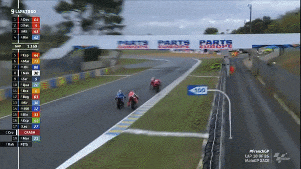 Lap 18 was a thrill a minute – Dovi made a pass for the lead into the Dunlop Chicane, Crutchlow fell from 7th in a disappointing end to his race, while Turn 9 was just mad.