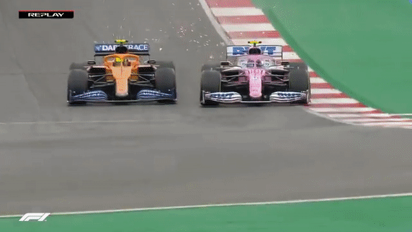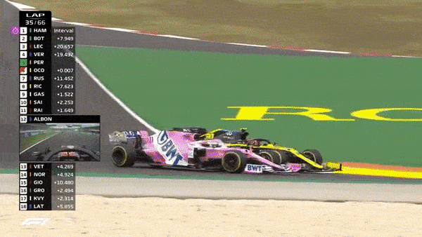 Stroll had now closed up to Norris in 7th place, but after getting the DRS into Turn 1 on Lap 18, the Canadian got a bit too aggressive and ambitious and tried swooping down the outside, but he ran out of room, cut off the McLaren, and the Racing Point was turned around at the first corner for the second time over the weekend.