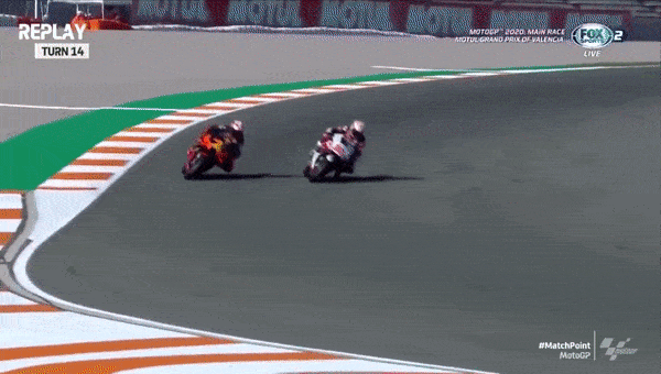 Another fine 3rd placing in 2020 for the younger Espargaro on the Red Bull KTM, with his 5 podiums in 2020 now the second-most for any rider behind the champion elect, Rins went from 14th to 4th, Binder made it both factory KTMs in the Top 5 and just about secured Rookie Of The Year, Oliveira backed up a 5th last week with 6th on Sunday, Dovi was an eyelash away from passing Mir for 7th on the line, Aleix Espargaro got Aprilia’s best result of the season with 9th, and Vinales was a lonely 10th.