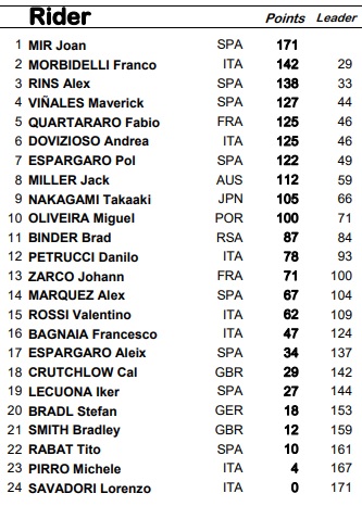 Just behind the Top 4, Oliveira was up to 5th, Rins went from 14th to 7th, and Mir was a comfortable 10th, while Vinales had dropped to 13th, running just in front of Rossi.