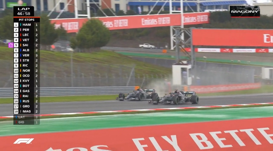 So at half race distance, it was still a Racing Point 1-2, but the Top 5 were all within just over 10 seconds of each other, as the front tyres on every car were so worn they just about resembled slicks, ironically as drivers were trying to stay out long enough to pit for slicks.