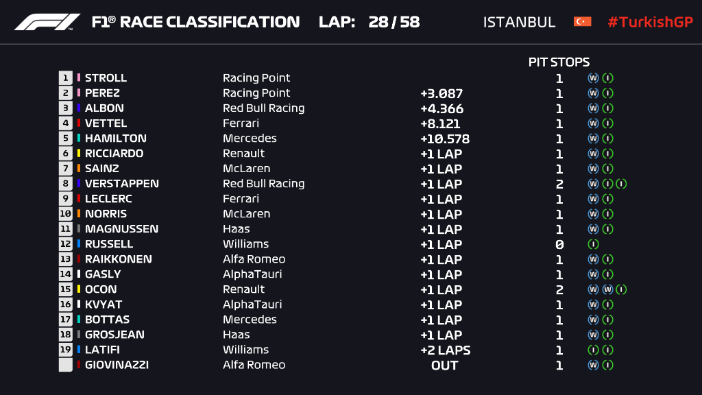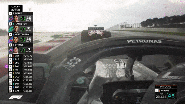 That reference point made Ferrari and Mercedes bring in Vettel and Hamilton (Mercedes put on a used set of Inters), and Racing Point called in Stroll on Lap 10, Perez was in on Lap 11, but a slow right front change cost him time.