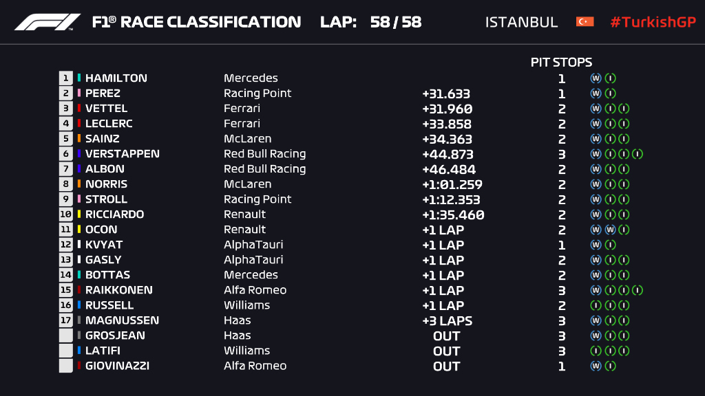 After a 9 year absence, Formula 1 returned to Asia Minor and the once revered Istanbul Park, and with Mercedes wrapping up the Constructors title, all Lewis Hamilton needed to join Michael Schumacher as a 7-time World Champion was make sure Valtteri Bottas, 85 points behind, didn’t outscore him by at least 8 points during the race.