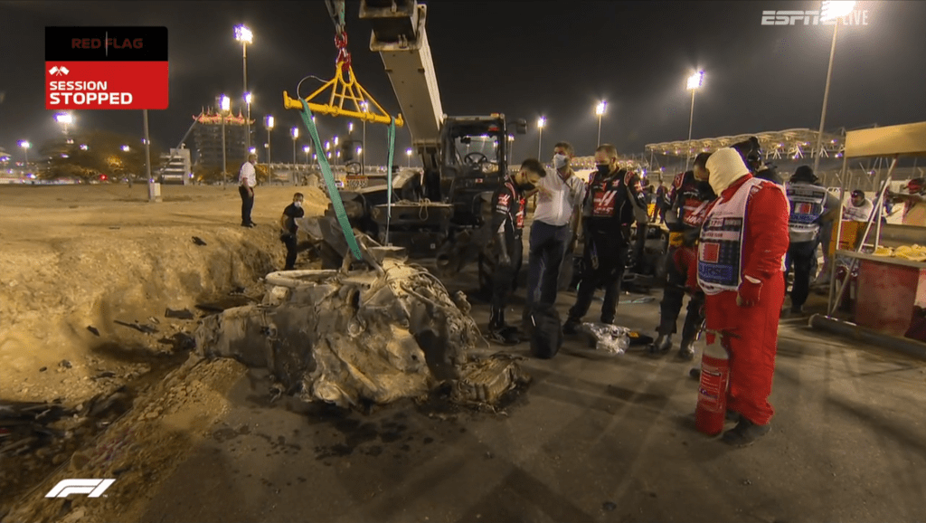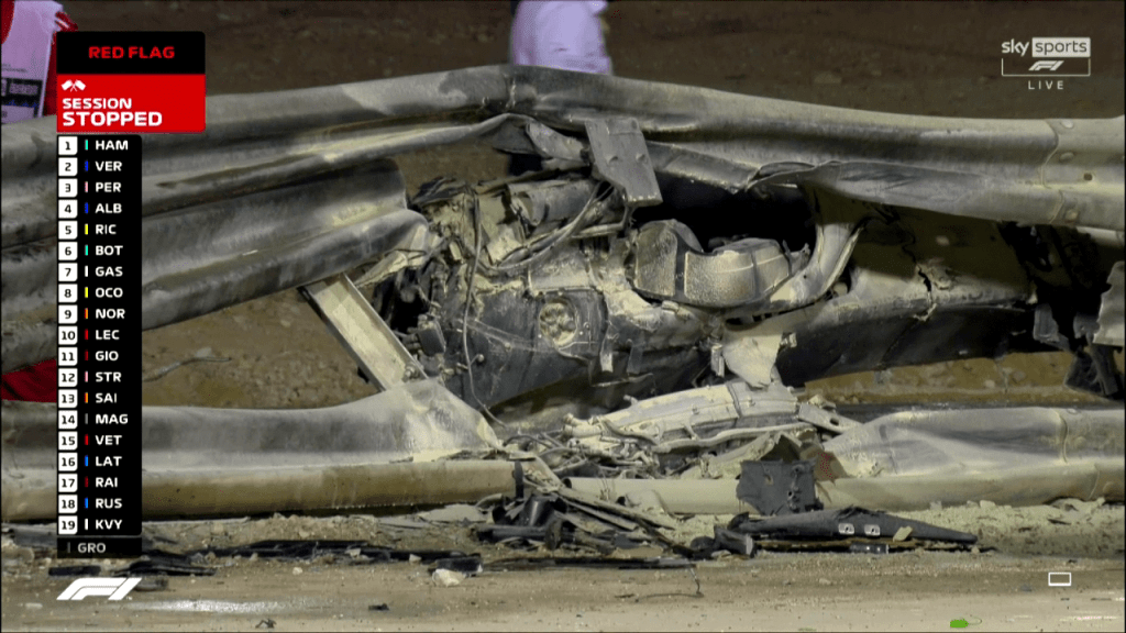 Romain Grosjean speared straight through an armco barrier at 200km/h, the Haas was ripped in half, and ignited into a fireball on impact.