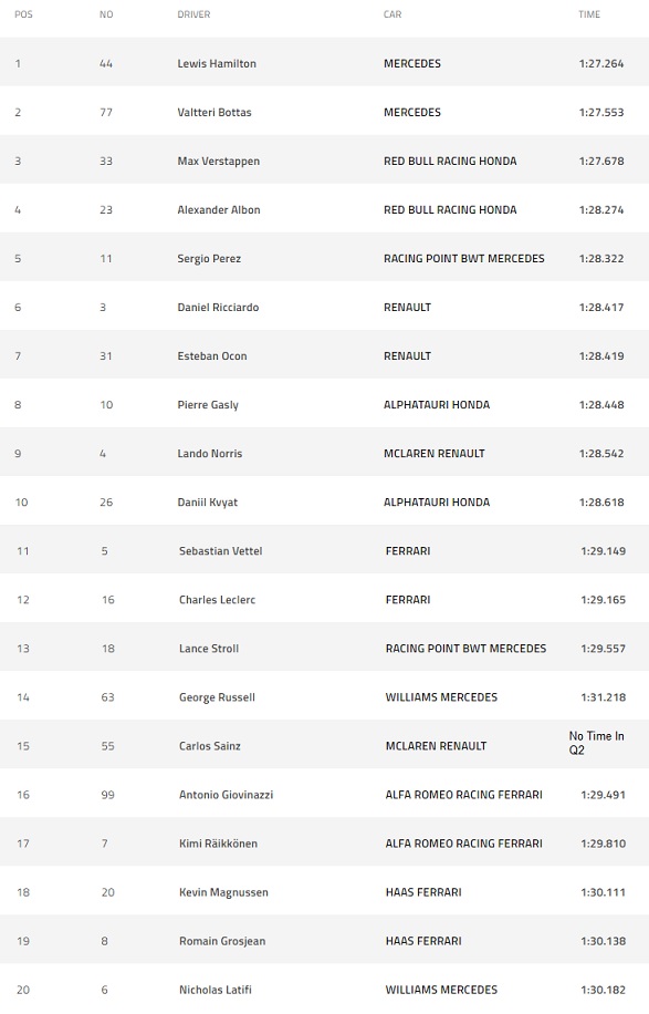 Ultimately, both Mercedes, Red Bulls, AlphaTauris and Renaults, plus Sergio Perez (Racing Point) and Lando Norris (McLaren) progressed, with every Top 10 driver setting their best time on Mediums, while both Ferraris were eliminated in 11th and 12th (After starting 1-2 in 2018 & ’19), as was Turkey polesitter Stroll in 13th, having been the victim of a miscommunication and trying his final run on used Medium tyres.