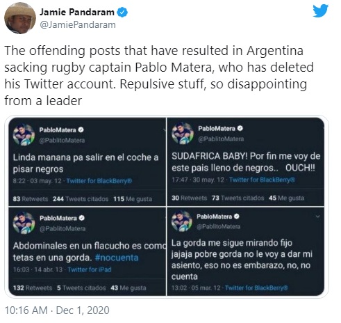 It looks like this all started when the Argentinian press & the Argentinian people weren’t too happy with the Pumas not displaying some form of a tribute to Diego Maradona (Heck, the All Blacks did a better job than they did), so someone somewhere went Twitter digging in revenge, and discovered the now ex-captain Pablo Matera (Who comes from an upper class background) was ‘a bit’ of an unabashed racist, and he apparently disliked fat women more than Al Bundy: