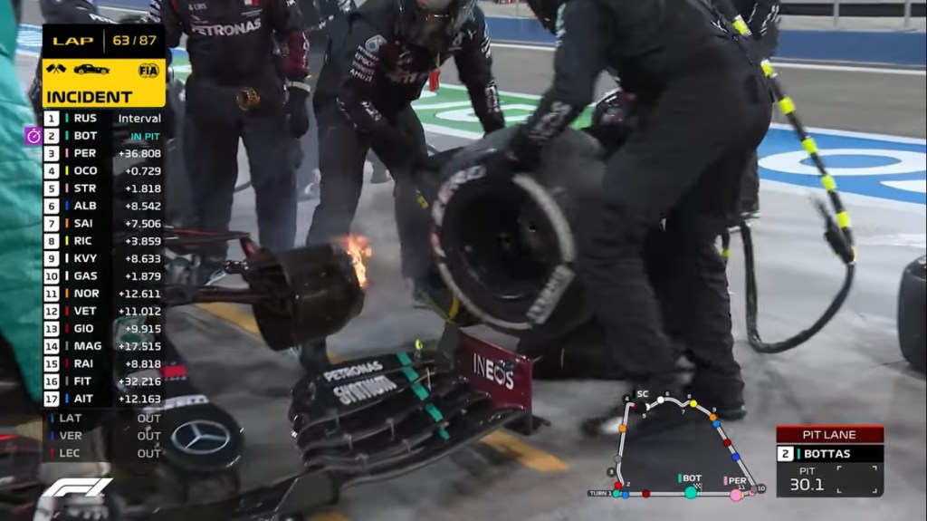 4. When Bottas stopped, he briefly had Russell’s front tyres attached, which the crew realised and rectified in a moment of panic, and Bottas, with his brakes overheating after being held stationary for 27.4 seconds, now had to go back out on his same old Hard tyre set, and he dropped from 2nd to 5th!