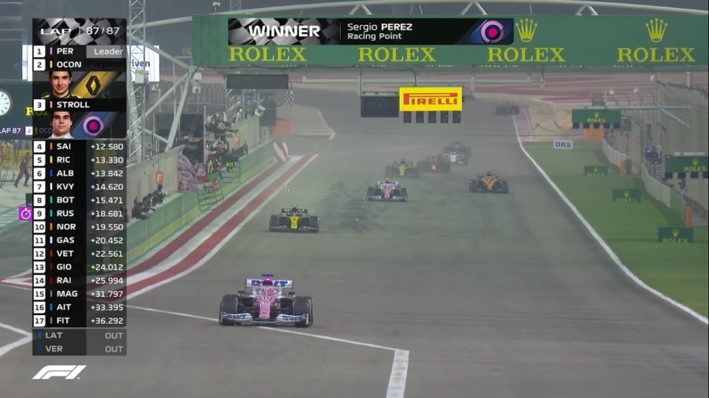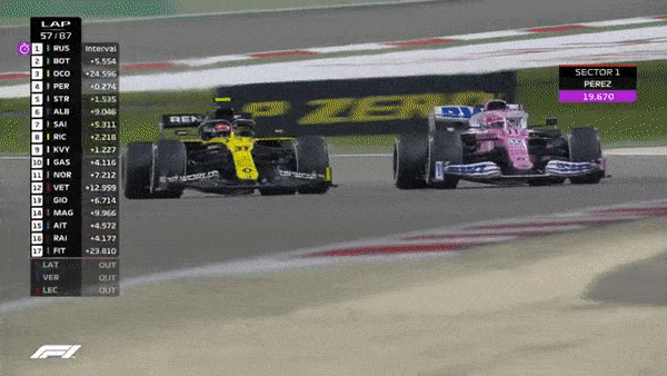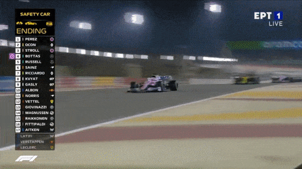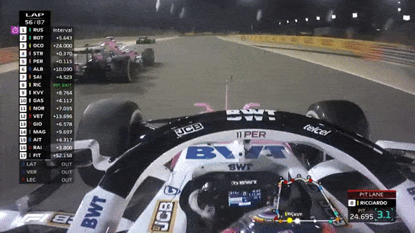 With Russell out of winning contention, Perez was some 8 seconds clear of Ocon and had 9 fingers on his first Grand Prix victory, with Stroll sticking to 3rd ahead of the charging Sainz, Ricciardo and Albon.