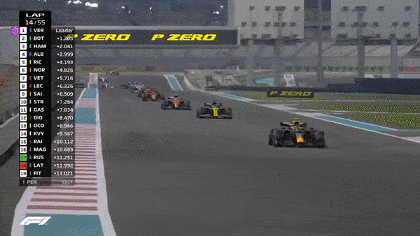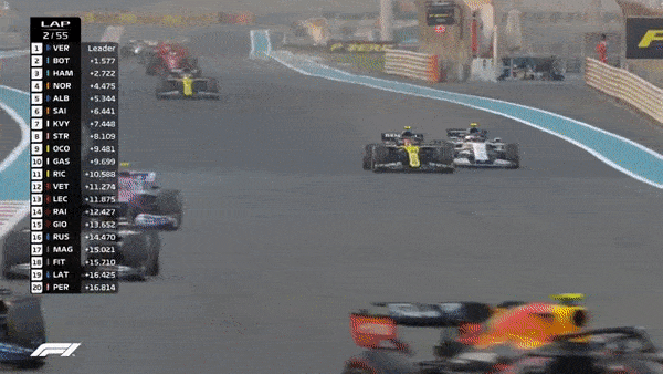So with the field bunched up, the order was Verstappen, Bottas, Hamilton, Albon, Ricciardo, Norris, Vettel, LeClerc, Sainz, Stroll in 10th, and Gasly fell to 11th place.