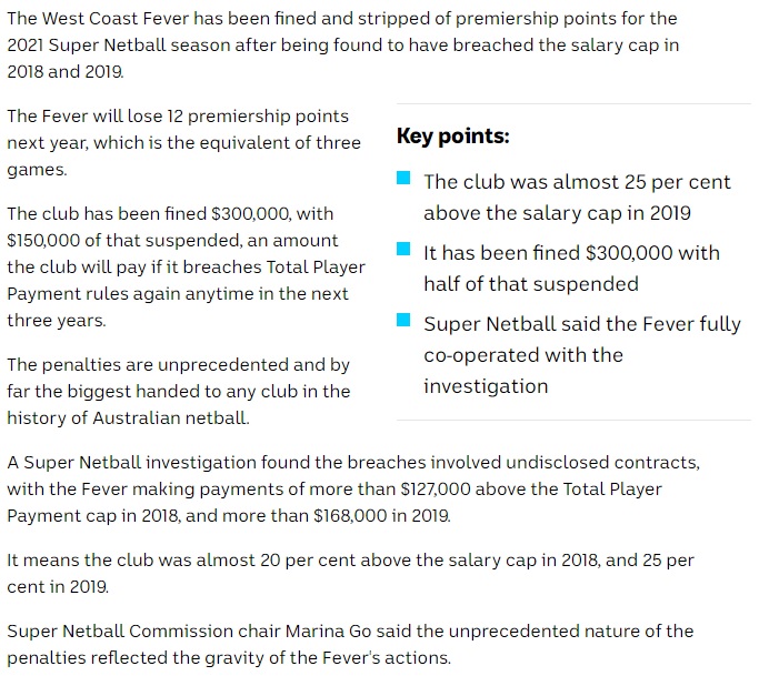 Starting on -12 points in 2021 and copping a $300,000 fine ($150,000 suspended) for going 25% over the Salary Cap was an almighty whack, which it had to be, considering the Fever committed the biggest financial breach in Australian netball history, but if you ask me, it didn’t go far enough.