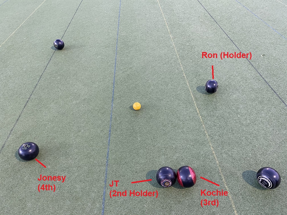 Needing something big to get back into it, Great Bowls took the Powerplay on the 5th End, but that idea very quickly went down the toilet when JT bowled two crackerjack deliveries, then Ron increased the hold to 4, as the Great Bowls couldn’t even land a bowl in the head, Rocket increased the hold to 5 by the time Kochie fired down a line drive to try and kill the head, which you can see in motion: