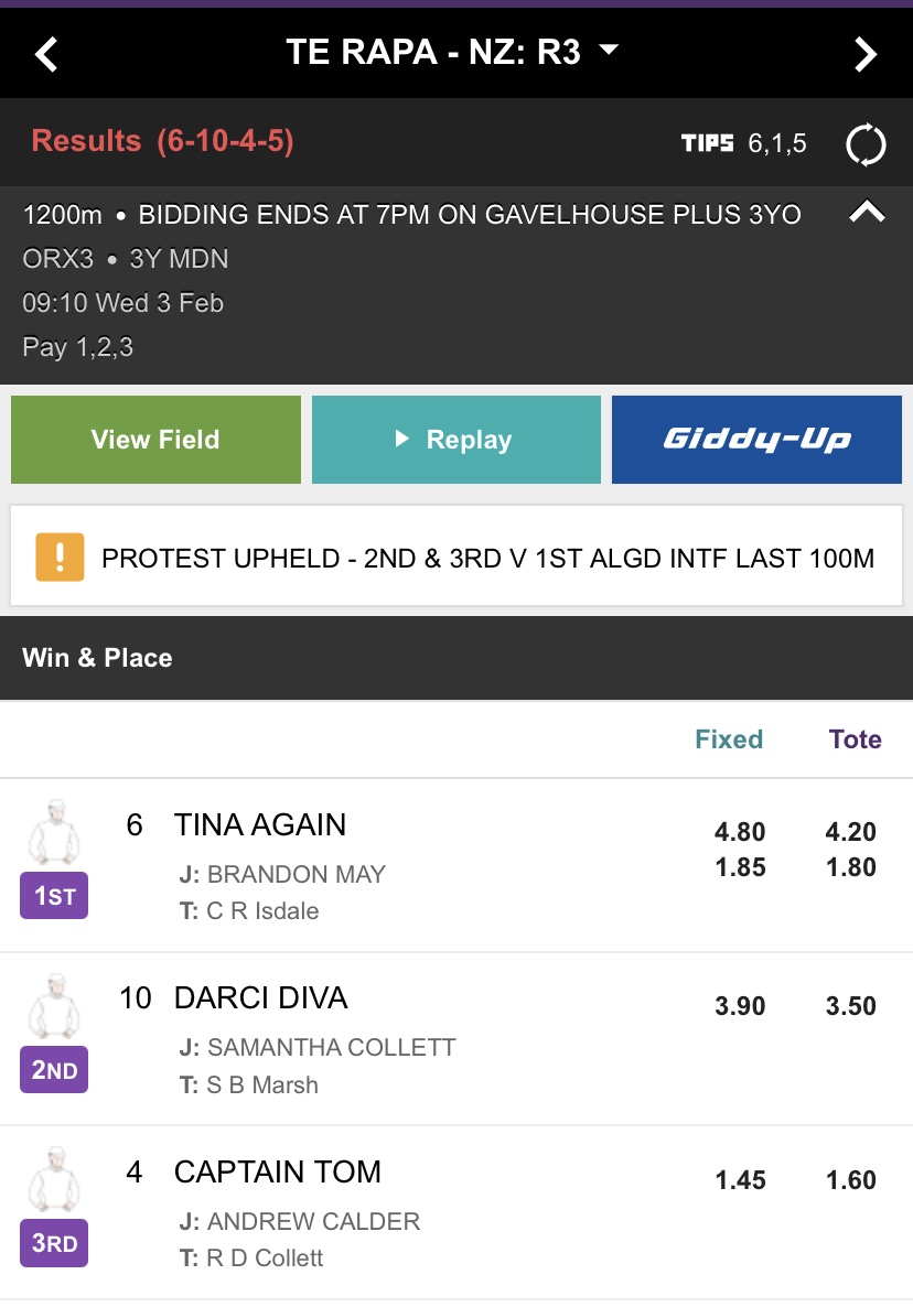 At Te Rapa in New Zealand earlier today, omen bet Captain Tom won Race 3, but was demoted to 3rd on protest for interference in the final 100m.