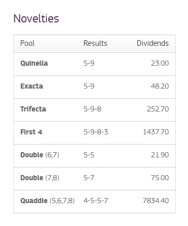 Long story short, the race was run, and The Cook steamed over the top and won at $7, and the good news was not only did The Gabster get a share of the $252 trifecta ($63) thanks to Tycoon Felix (No.9) and Tiny Hussy (No.8), Whatarap (No.3) got in for 4th and the First 4 paid $1437, giving him just over $179.