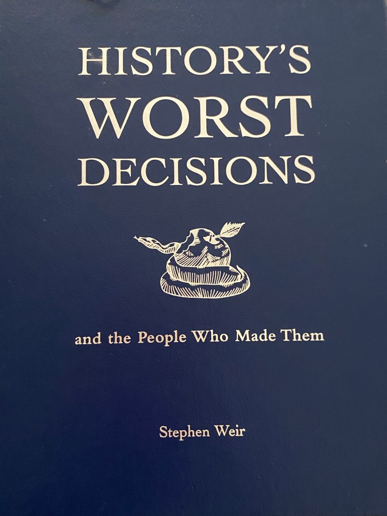 So between Thursday and Friday, and most of today, I was staying at my Nan & my late Da’s unit in Lindfield, and among Da’s old book collection in the study was a relatively newer piece of work from 2005, written by Stephen Weir, about some of history’s great arse-ups, like Ismay not putting enough lifeboats on the Titanic, Sir Douglas Haig planning the Somme, ‘Pig Iron Bob’ Menzies allowing the British to test nuclear weapons at Maralinga, Grunenthal not testing the effects of Thalidomide before they rushed it on the market, Robert McNamara unleashing Agent Orange on Vietnam, and many other delightful decisions that had horrendous consequences: