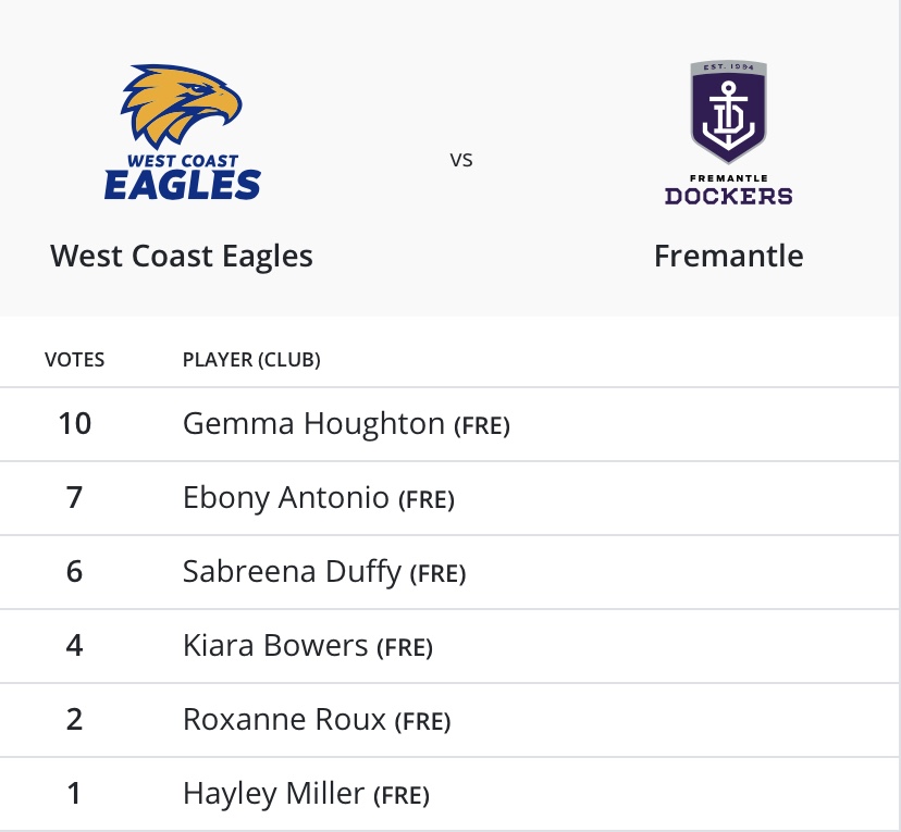 Obviously the Dockers won that game with two legs in the air, but Kiara Bowers, who was awarded best afield by the press for the third time in as many AFLW Derbies between Fremantle and West Coast, only got 4 votes in the Coaches’ Votes (For the uninformed, both coaches poll 5-4-3-2-1).