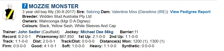 Regardless, the talent is clearly there, Jamie Kah takes over from D.Oliver, and I would think that with a more genuine tempo she’ll be back in the finish again, and something else I’ve noticed is that Annavisto was foaled on the 29th of September 2017, the day before Richmond broke their 37-year premiership drought, a fact I’m bringing up because the second favourite in this race is Mozzie Monster, who wears the fabled Tigers colours… YELLOW AND BLACK!