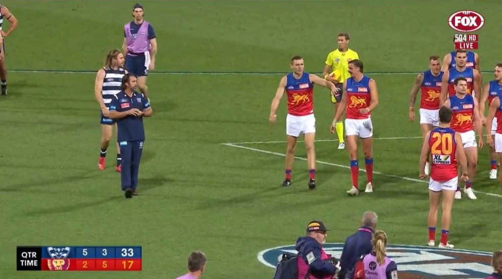Chris Scott having a heated chat to Joe Daniher during the quarter time break