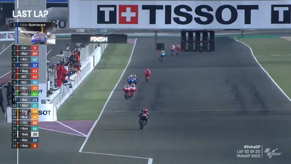Quartararo was now looming into the race, having risen to 5th with plenty of tyre life still in hand and lapping much faster than the Ducatis, and further down, Pol Espargaro had risen quietly up to 10th place, and with only 5 laps to go, the margin from the race leader to Miguel Oliveira in 15th was only 5.3 seconds, which was well on course to shatter the closest Top 15 finishers in history, which was 15.093s in Qatar in 2019.