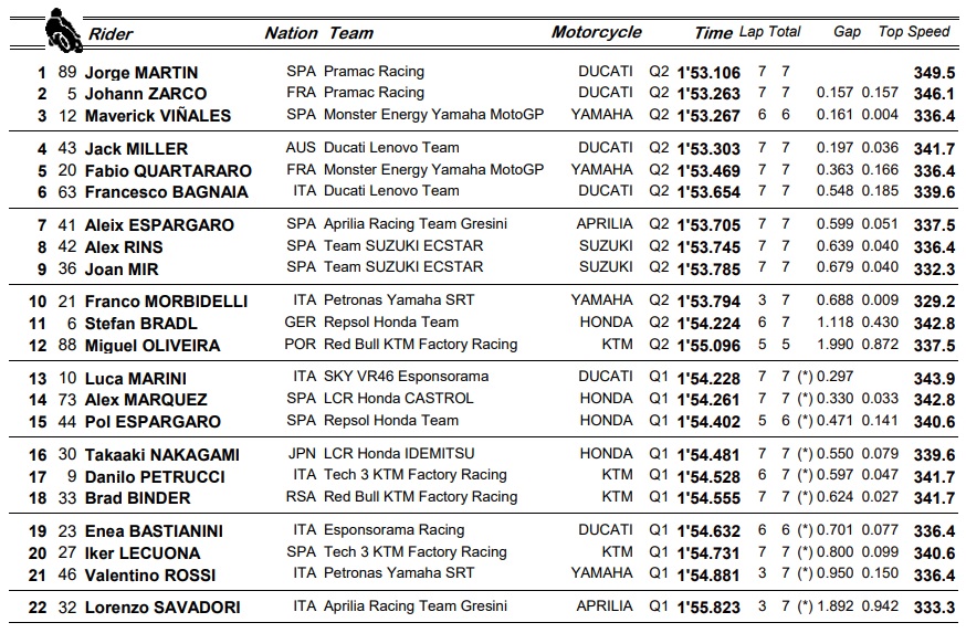 Vinales would complete the front row, with Jack Miller saving face to take 4th on his last lap, which was was described by Fabio Quartararo (5th) as the scariest thing the Frenchman had seen in his MotoGP career, thanks to a monster moment for the Queenslander at Turn 3 that was never shown on TV, and the fact that Miller actually improved his time led to Fabio complimenting Jackass on his “Big balls.”