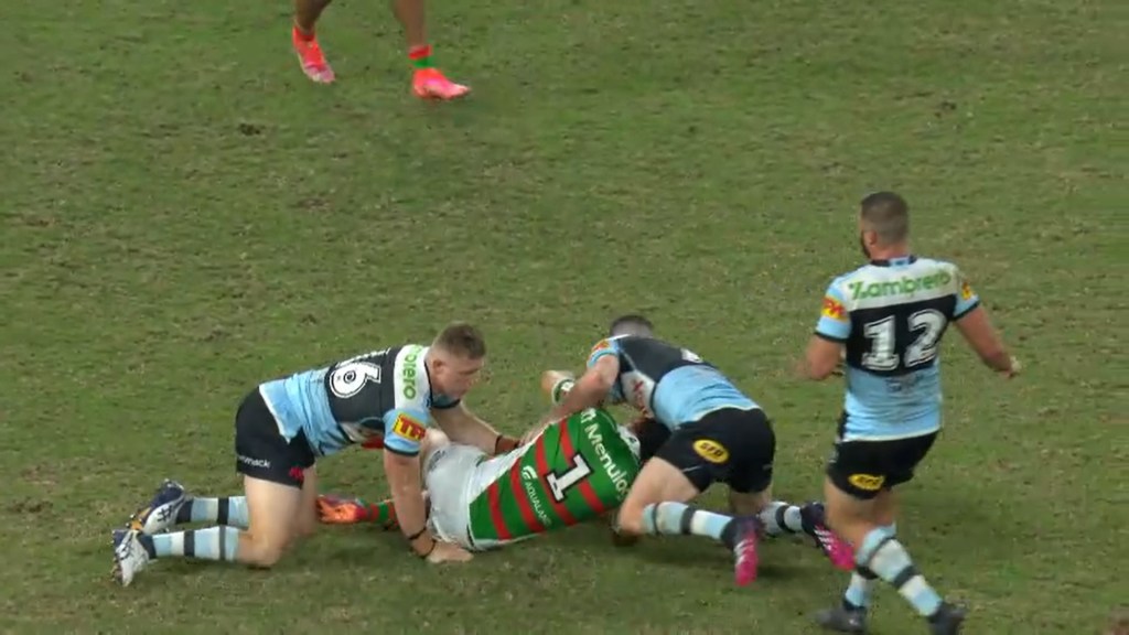“Oh, Souths are late into a set close to the Sharks line? Well, I’ll just let you get through two more tackles before I randomly stop the game to let the referee report and penalise Chad Townsend for a textbook tackle and completely crush Cronulla’s momentum as Cody Walker scores the winning try.”