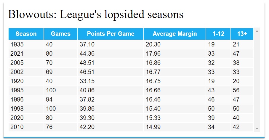 Well the news of the week since yesterday, aside from blowing up about mass sin-binnings and send offs, is that Fox League have promoted more young rising talent by hiring Ray Hadley, the Queensland Firehawks have fired in their expansion bid, because there’s nothing like expanding into a city where the league has had a successful First Grade team for 33 years, and the Courier Mail ran the numbers and worked out that the average winning margin is just under 3 converted tries through the first 10 Rounds, the most lopsided start to a season since 1935: