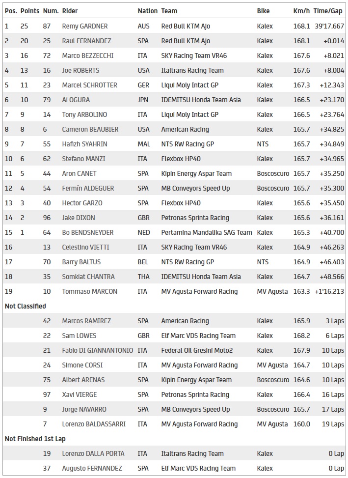 It was the second-closest Moto2 finish in the class’ 11-year history, bettered only by Tom Luthi and Franco Morbidelli being split by 0.010s at Australia in 2016, and as far as last lap contests for the lead between Australians and Spaniards go, it was the best since Mick Doohan and Alex Criville at Brno in 1996, when Criville won by a mere 0.002s in the closest finish in Grand Prix history.