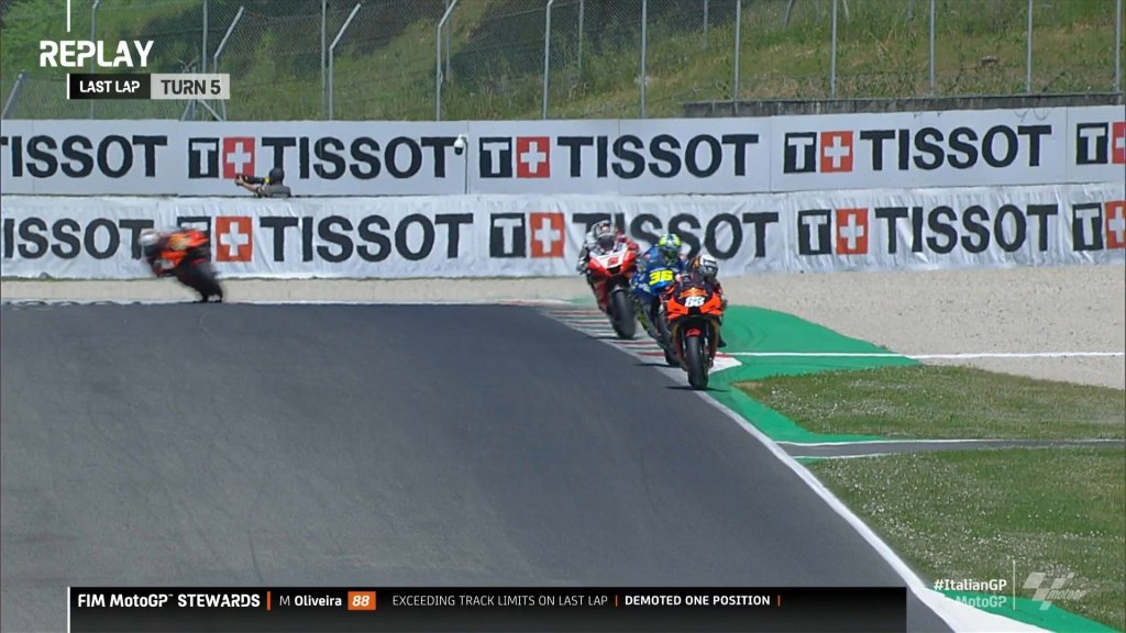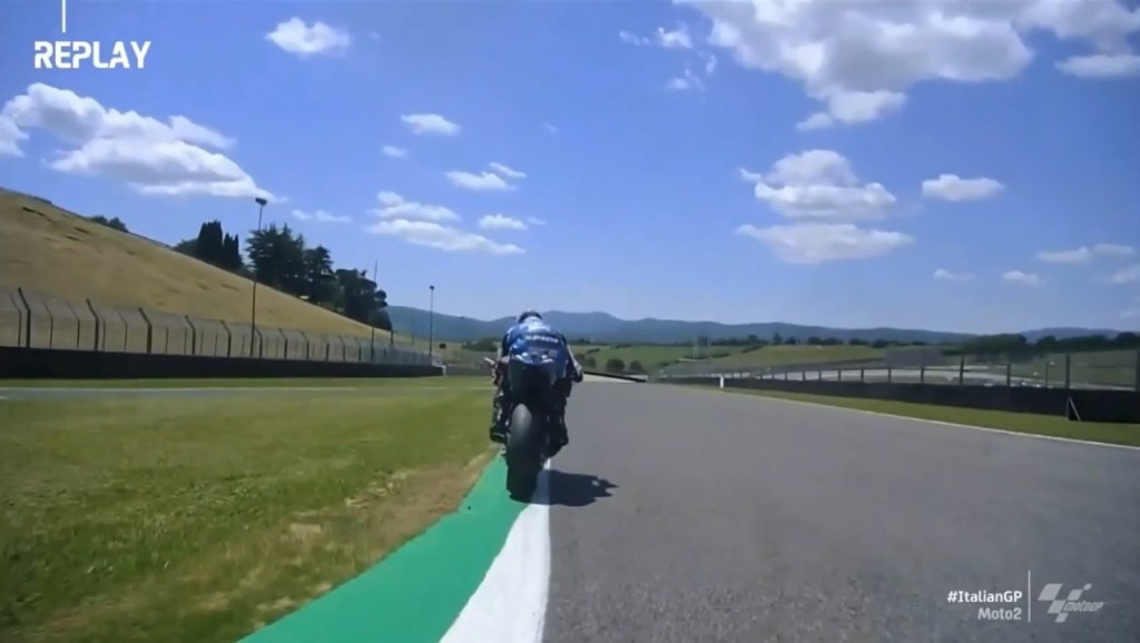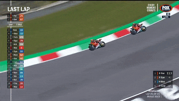 In a similar finish for 3rd place 8 seconds back, Roberts held on ahead of Bezzecchi by 0.017s, but the American was left devastated after he was demoted to 4th for exceeding track limits by a bee’s diaphragm at Turn 5 on the final lap!