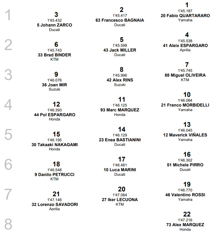 Aprilia equalled their best-ever qualifying result in the four-stroke era with 4th for Aleix Espargaro, despite Aleix being fresh off arm pump surgery, Jack Miller started 5th in pursuit of a winning hat-trick, Brad Binder set a new Mugello top speed record in FP3 (362.4km/h) and started 6th in his first Premier Class start at Mugello, Miguel Oliveira on the other factory Red Bull KTM headed the third row ahead of the Suzukis, Franco Morbidelli started 10th, and the factory Hondas of Marquez and Pol Espargaro didn’t improve on Q1 to start 11th and 12th.