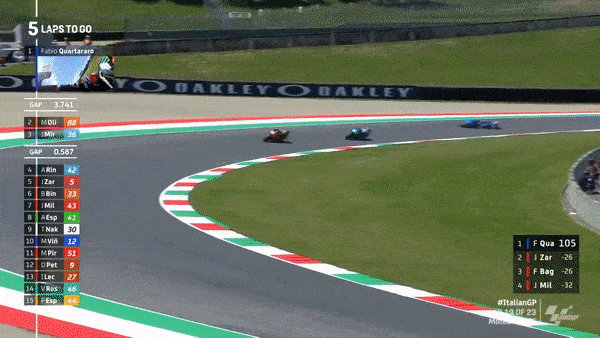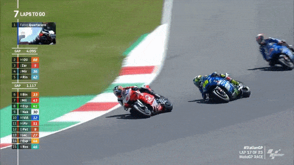 Now up to 2nd, Zarco used the slipstream to take the lead from his compatriot down the pit straight to end the lap with a new race lap record 1.46.810 (Which remained the fastest lap), but Fabio was back ahead at Turn 3 on Lap 4, and he would stamp his authority once again, break out of the slipstream of the Ducati, and lead every lap for the remainder of the afternoon.