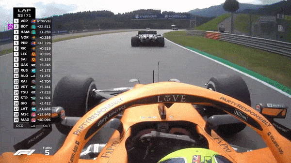 Bottas was originally told not to overtake Hamilton, who had a damaged car and was 20.8 seconds behind Verstappen, which was inviting Norris to close back up, however, on Lap 51, the Mercs backflipped and allowed Valtteri to race Lewis due to the threat of Lando, although Mercedes pretty much swapped the cars and allowed Bottas ahead at Turn 3 on Lap 52, which also allowed Bottas to briefly set a fastest lap with the DRS advantage, but Norris was now within DRS range of Hamilton, and he was about to even the score.
