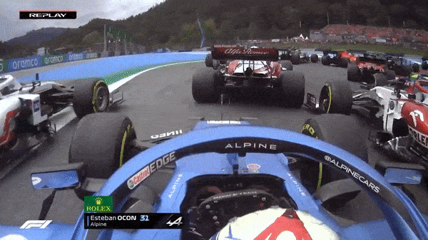 Once the lights went out, Verstappen covered Norris up the inside into Turn 1 and held the lead from the McLaren, Perez covered off Hamilton as the cars travelled through the smoke from the orange flares, and before the field reached the end of Lap 1, the Safety Car was deployed as Ocon’s rotten weekend ended when he was caught in a sandwich and made contact with Giovinazzi at Turn 3, instantly busting the front right suspension and leading to the French driver stopping next to a service road on the run to Turn 4.