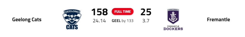Round 21, 2018 at Kardinia Park – 3.7-25 to 24.14-158, a game in which Fremantle LED AT QUARTER TIME, only to concede the final 23 goals of the game and suffer the heaviest defeat in their history