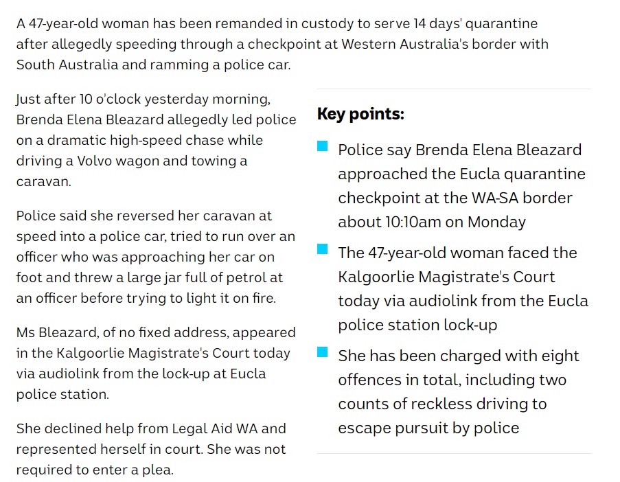 If she’d been stopped at the SA border without a G2G pass she would’ve been fined and turned away – Now that she’s charged through the border police like John Wayne through a pack of native Americans and supposedly committed several serious offences, she gets a few warm meals, and she gets to stay in WA during the peak of the third wave.