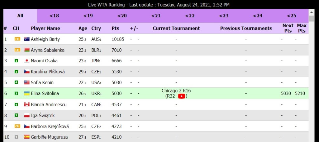 It’s the second time Barty has crossed 10,000 points in her entire run as World No.1, having crossed 10,000 when she made the Madrid final in May, and that unbroken run at No.1 is now up to 83 consecutive weeks (90 overall), and Barty now has a large 3,175 point gap to Aryna Sabalenka, who jumped up to a career high No.2 with Naomi Osaka going out early, which means the Belarussian will be seeded 2nd for next week’s US Open ahead of the defending champion.