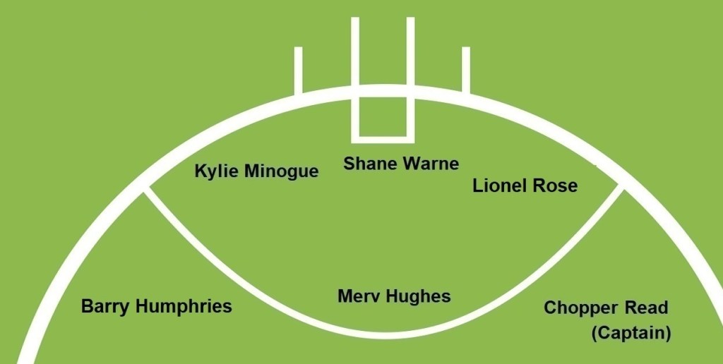 Finishing off the forward line, and at Left Half Forward it’s Barry Humphries, who should link up very well with Dame Edna, while the final half forward spot was harder to pick than a broken nose, because it tied in directly to the debate about which which well-known criminal should make the team, mainly because the selection committee was fearing for their lives throughout the entire process.