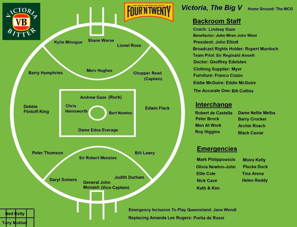 Well it’s the long-awaited conclusion to the State of Origin All-Stars, and by far the hardest team to pick was Victoria, the state that brought Australian rules football to everywhere in the world except New South Wales, and naturally you could make a seconds, thirds, fourths and fifths team of all the Victorians that were unlucky to miss out on this team, such is the depth they’ve got, and that’s even before they pull the bullshit the VFL used to do in the 20th century and pick players that weren’t even born in Victoria, they just happened to be in Victoria at the time.