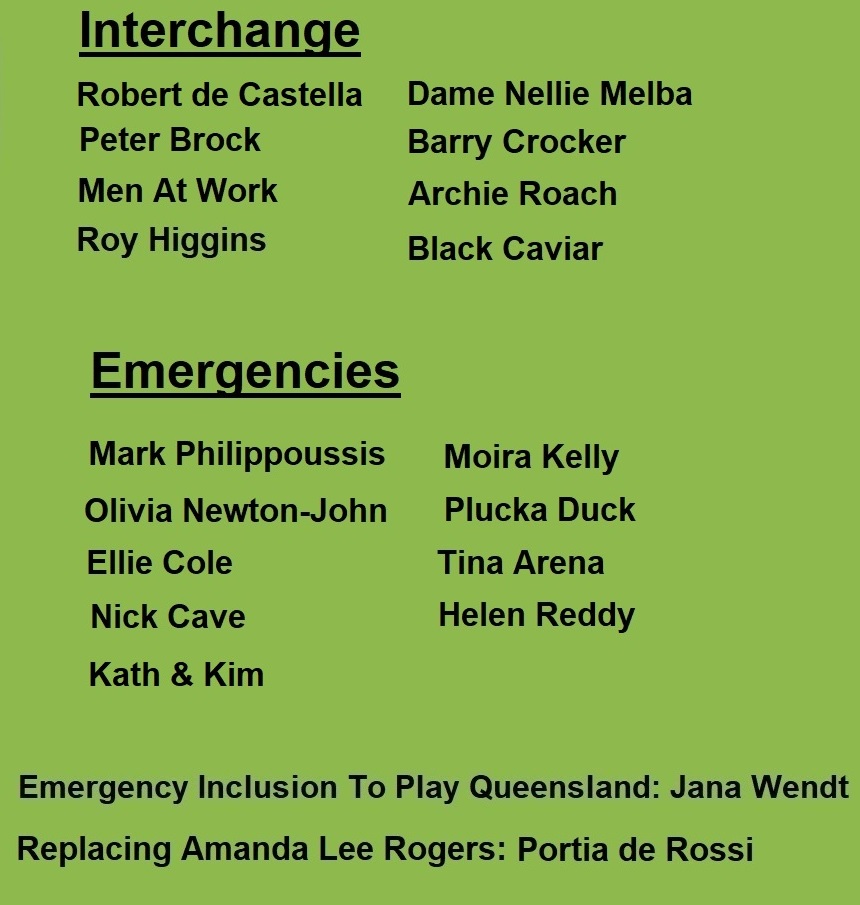 Mark ‘The Poo’ Philippoussis, host of The Age Of Love, Olivia Newton-John, best remembered for representing the UK in Eurovision in the same year that ABBA won it with Waterloo (1974), 6-time Paralympic Gold Medalist Ellie Cole, who can push for a starting position if she can nab a medal in Tokyo this fortnight, Nick Cave can get in if he agrees to do another duet with Kylie Minogue, one of Australia’s leading humanitarians in Moira Kelly, legal guardian of the brothers Emmanuel and Ahmed Kelly (Swimming for Australia at the Paralmypics), and the one-time conjoined twins Trishna and Krishna, and Moira must get sick of being mistaken for the actress Moria Kelly, who voiced Nala in the original Lion King.