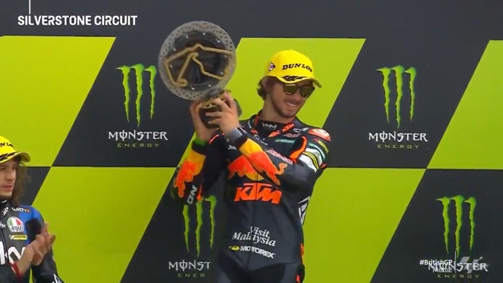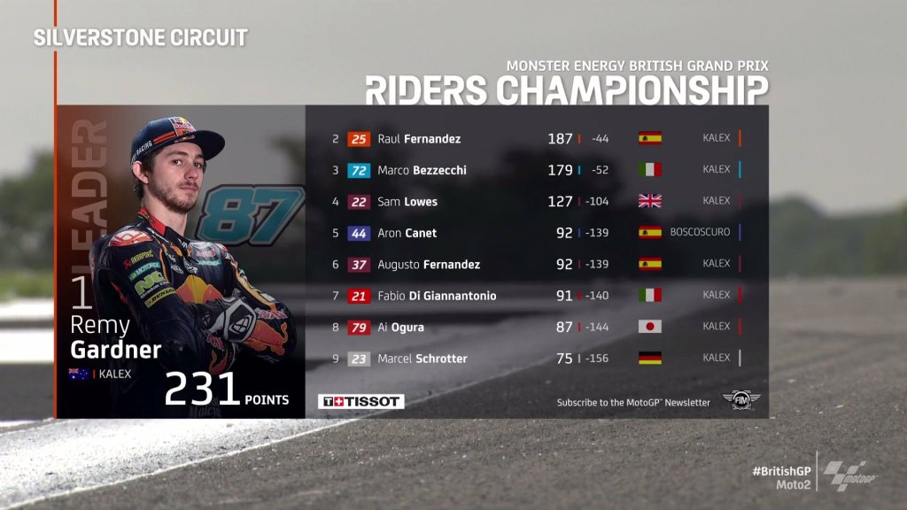 A fantastic way for Gardner to shoot back to form after two disappointing outings in Austria had seen his championship lead whittled down to 19 points by teammate Raul Fernandez, who unfortunately fell 4 laps from the end, which means Gardner’s lead is now back out to 44 points, and of course, Remy replicated what his dad achieved on a 500cc Honda back in 1986, and that’s win at Silverstone.