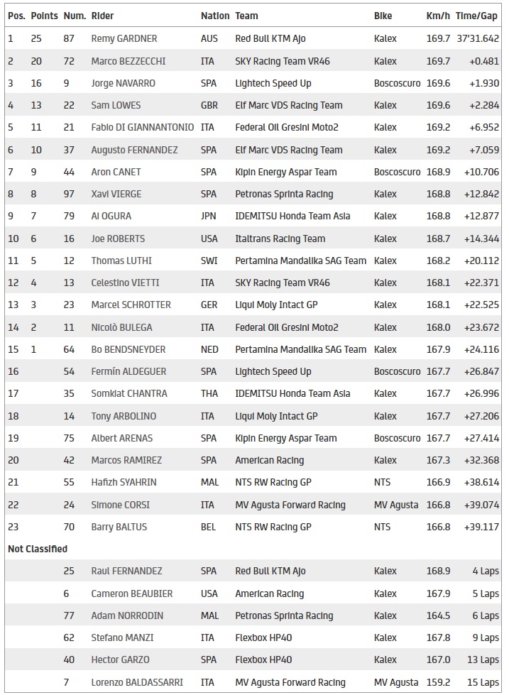 Straight off the top, Remy Gardner came through to win after avoiding a few near wipeouts earlier in the race, starting from when he had to check himself up in the corners, which dropped him down to 5th, then when Marco Bezzecchi sat himself up at The Loop, which almost led to Gardner wiping both of them out: