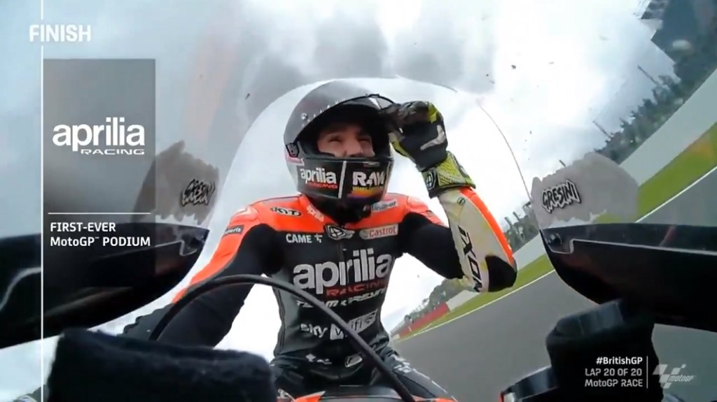 For the record, it was Aprilia’s first podium in the Premier Class since Jeremy McWilliams finished 3rd in the 2000 500cc British Grand Prix at Donnington, which you may remember was also Valentino Rossi’s maiden premier class win.