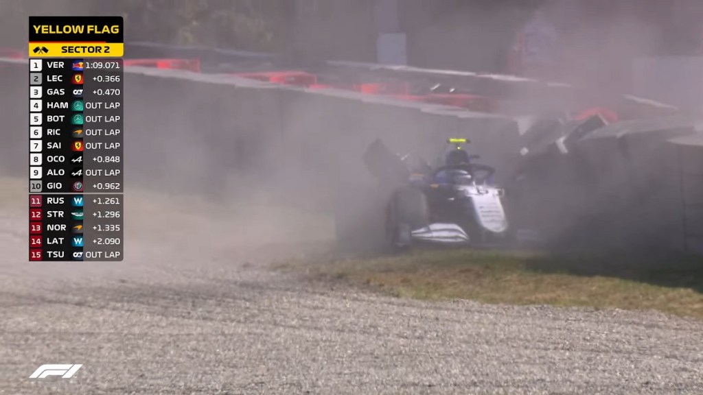 After the success on Saturday last week, Williams were back in the wars as George Russell backed into the wall during Q2, leaving him to start 11th, and with 2 minutes to go, Nicholas Latifi dipped a wheel on the grass at Turn 8, lost the rear and flew backwards into the barrier, which brought about an early end to the second session.