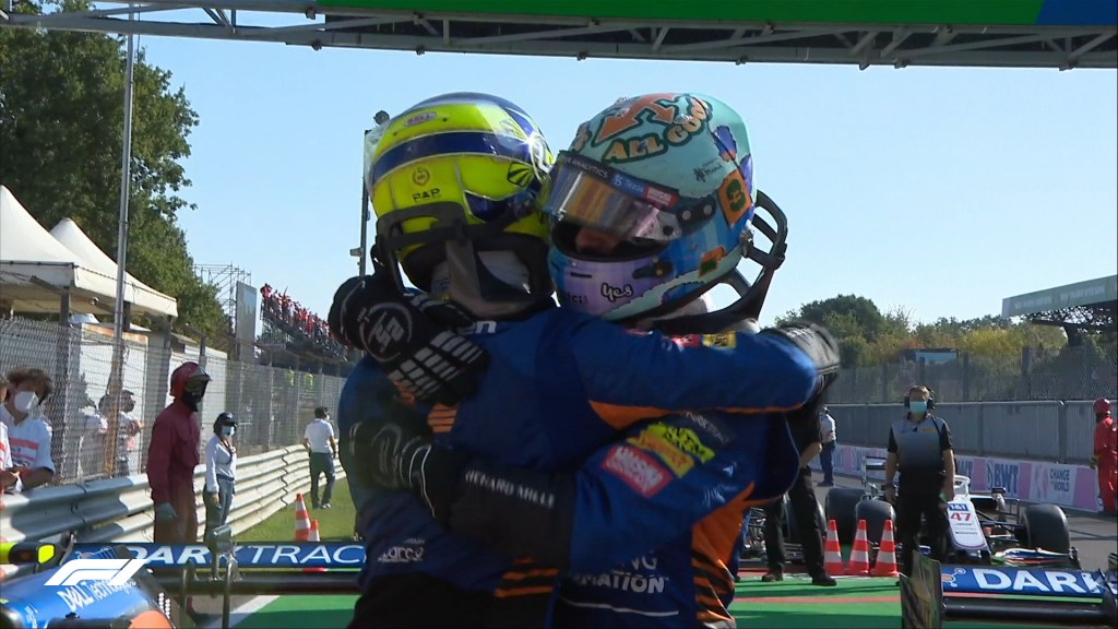 Lando and Daniel hugging it out after McLaren’s first 1-2 finish in 11 years